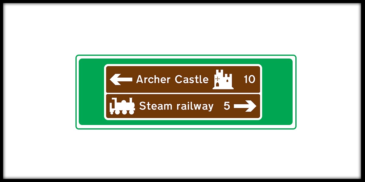 ![]() | There is a tourist attraction ahead. The sign may show the name, type, and direction of the attraction. It may also display a symbol or logo that represents the attraction. |
